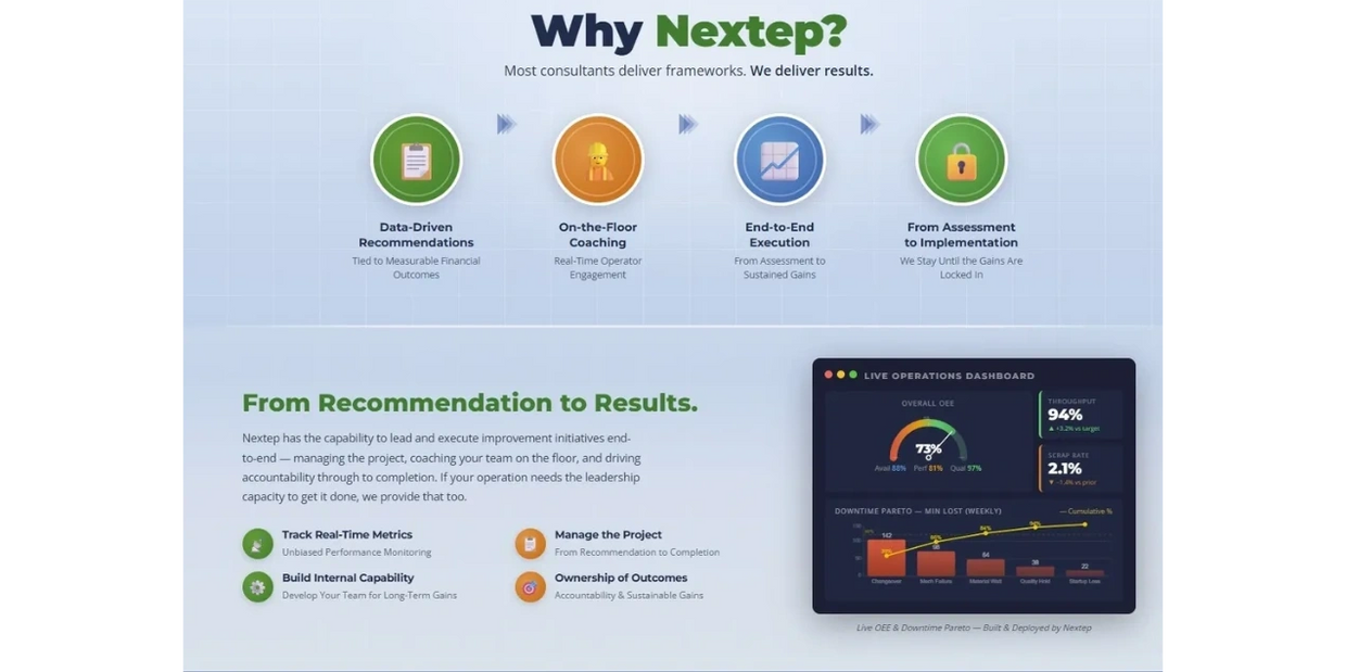 Nextep has the capability to lead and execute improvement initiatives end-to-end — managing the project, coaching your team on the floor, and driving accountability through to completion. If your operation needs the leadership capacity to get it done, we provide that too. From initial assessment through full implementation, we stay until the results are real and the gains are locked in.